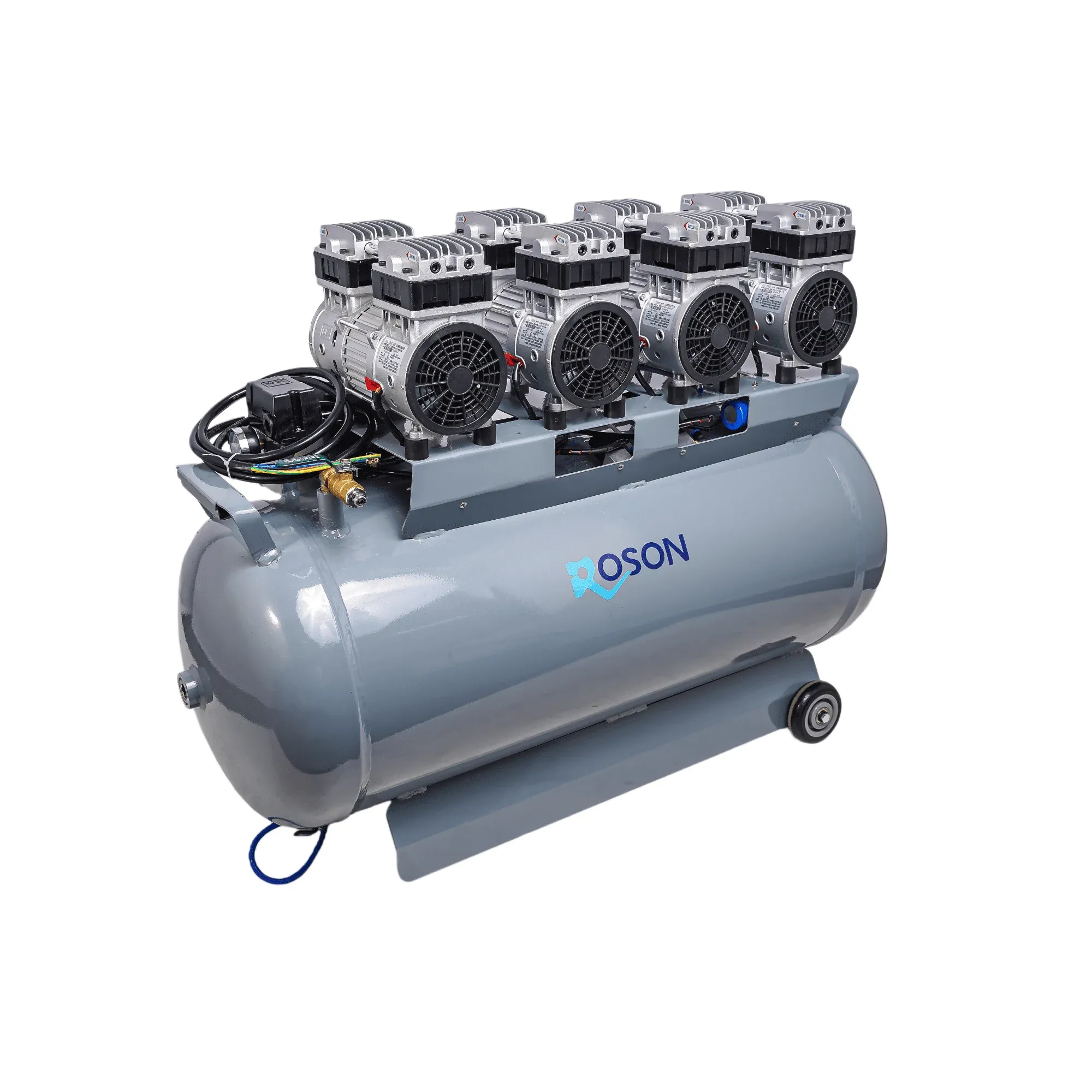 Компания Foshan Roson предлагает высококачественный безмасляный стоматологический компрессор. Он эффективно подает мощный и чистый воздух в пневматические инструменты, упрощая работу стоматолога и позволяя ему сосредоточиться на процессе лечения. Компрессор прост в использовании и обслуживании, почти не издает шума и защищен от коррозии. Функция автоматического сброса давления предотвращает перегрузку оборудования, продлевая его срок службы.